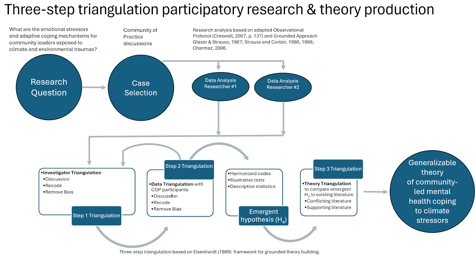 I provided the research framework drawing on an observational protocol (Creswell, 2007, p. 137), a grounded theory approach (Glaser & Strauss, 1967; Strauss and Corbin, 1990, 1996; and Charmaz, 2006) and a co-production method for theory building (Eisenhardt, 1986). The Climigration Network helped with getting informed consent from the CoP participants. I trained Camille in qualitative thematic analysis, and we got to work co-interpreting the texts of CoP recorded discussions.